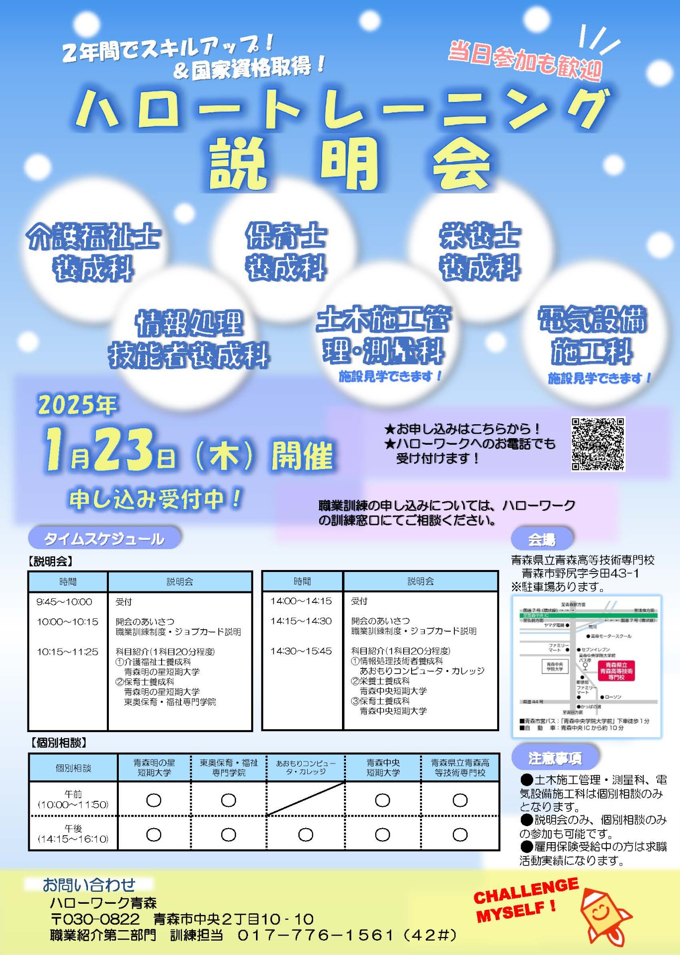 ※本相談会は、ハローワーク青森主催のハロートレーニング説明会に関連した事業です。