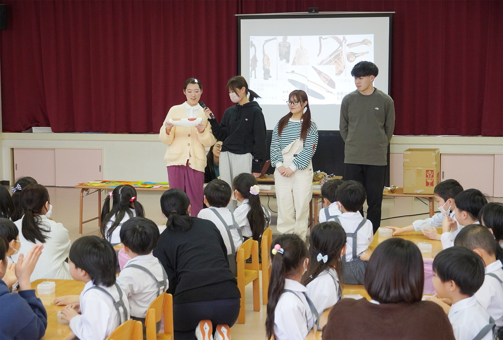 幼児保育学科の学生がレインスティックについて説明すると園児たちは、実際にさわって音を出して興味を持っていました。
