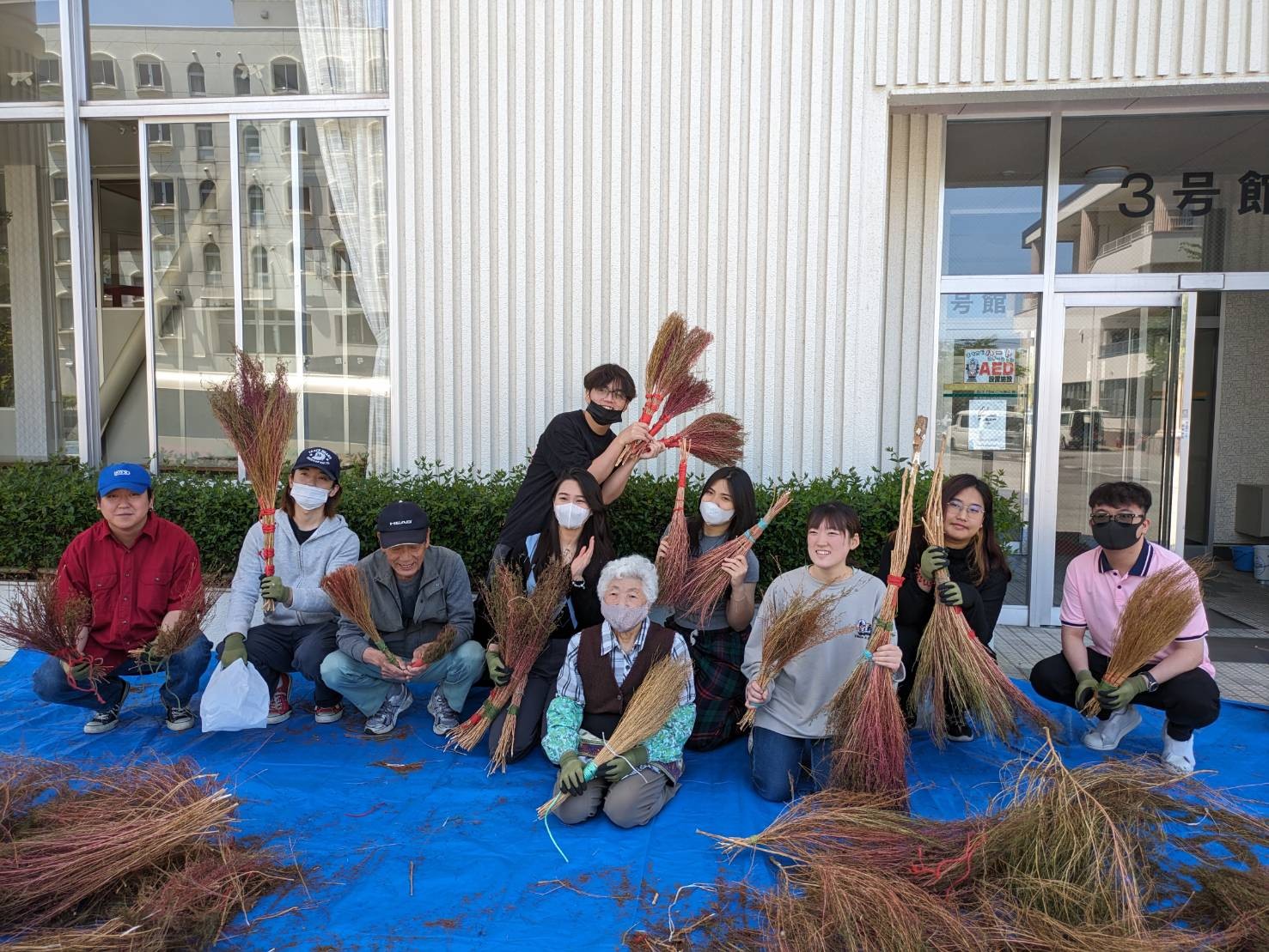集会には、昨年ホウキ作りを経験した本学卒業生もお手伝いにかけつけ、上手に作るコツを伝授していただきながら、昔ながらのホウキ作りを楽しみました。このような地域交流を行うことで、学生は多くの文化を学んでいます。