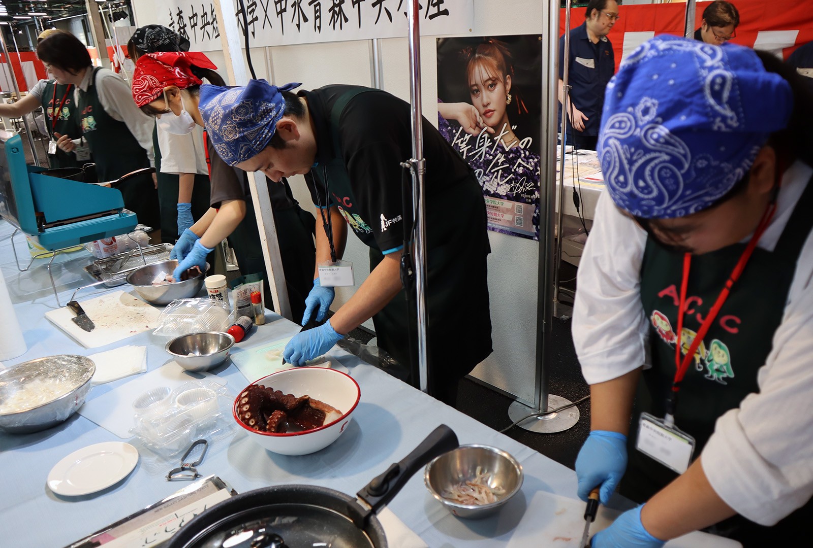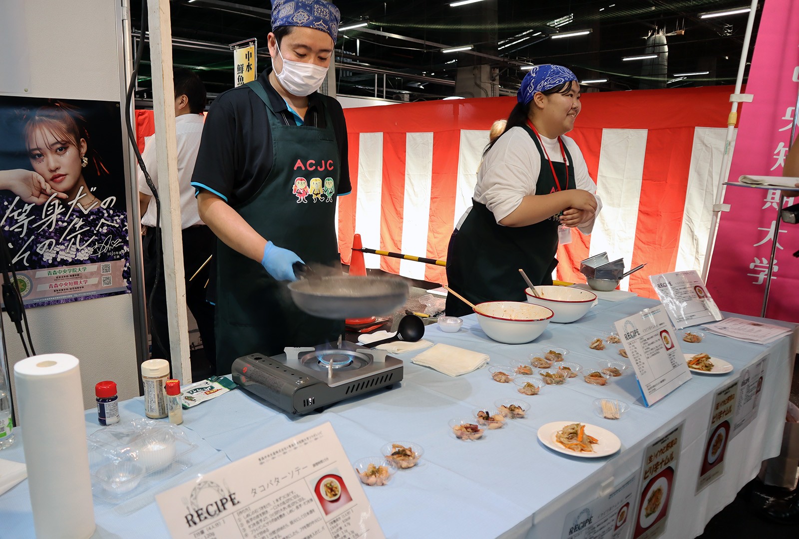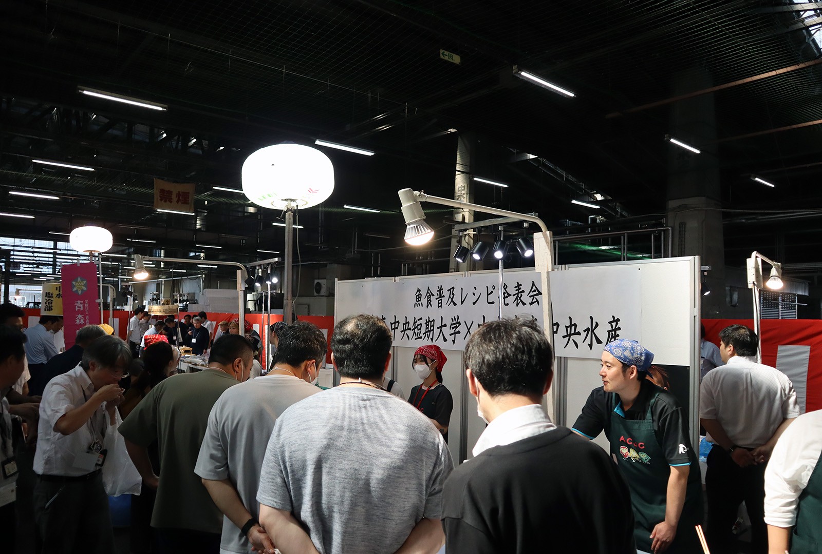 発表会開始前に会場へ到着した学生たちはさっそくブースの設営を行い、魚や野菜の仕上げ調理をして試食用メニューを完成させました。展示会が始まり、会場内それぞれの展示ブースで商談が行われる中、魚食普及レシピブースにも続々と人が集まり、レシピに興味津々の来場者で大盛況となりました。