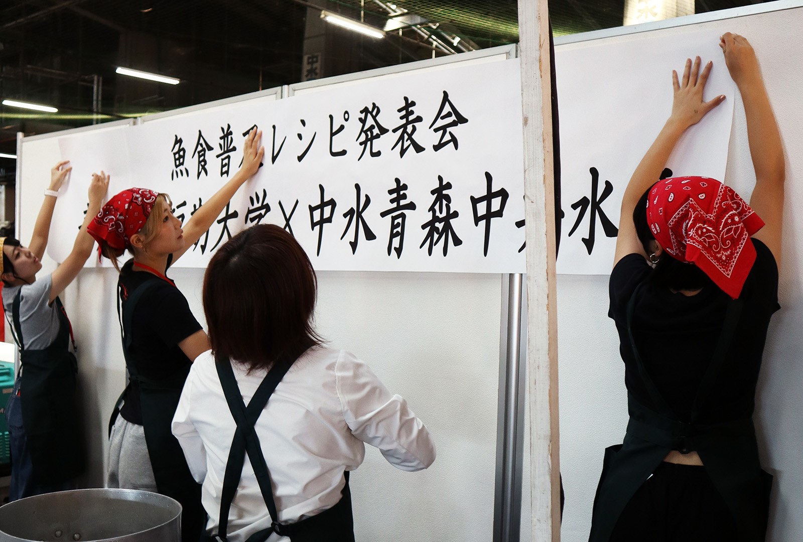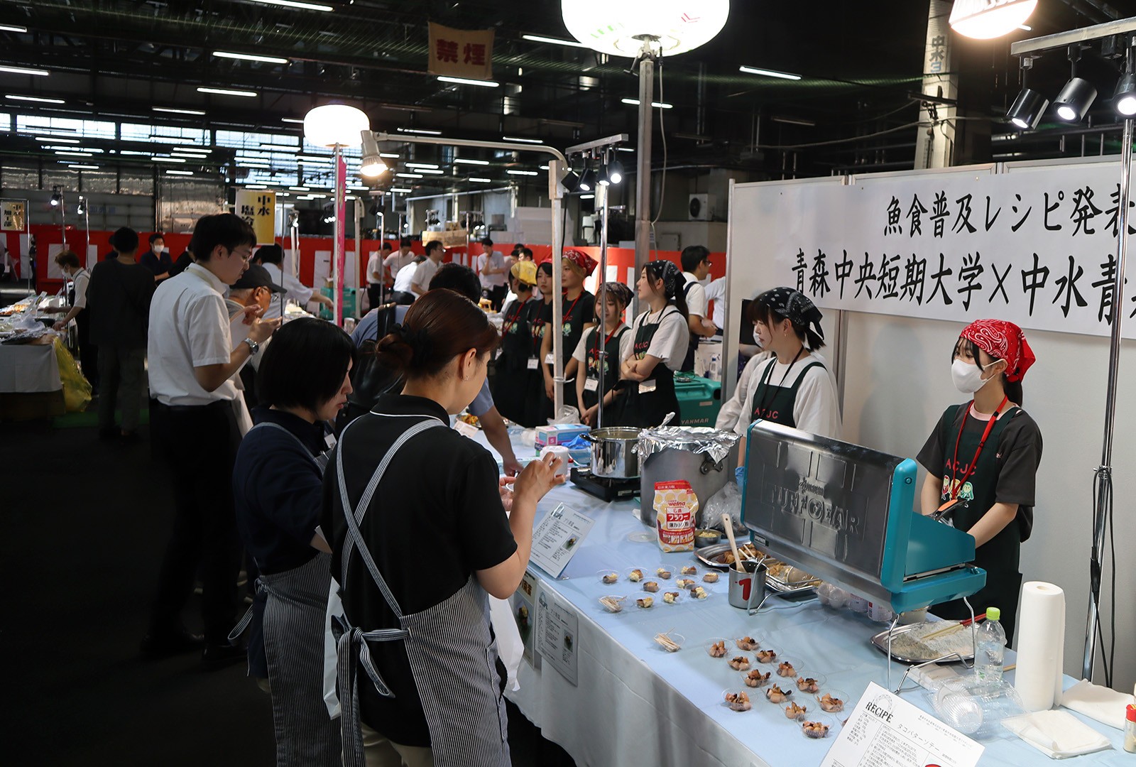 青森中央水産株式会社で2025年9月12日に開催された「2025年度青森中央水産株式会社年末商品展示会」において、本学食物栄養学科の学生が開発した「魚食普及レシピ」の発表会を行いました。