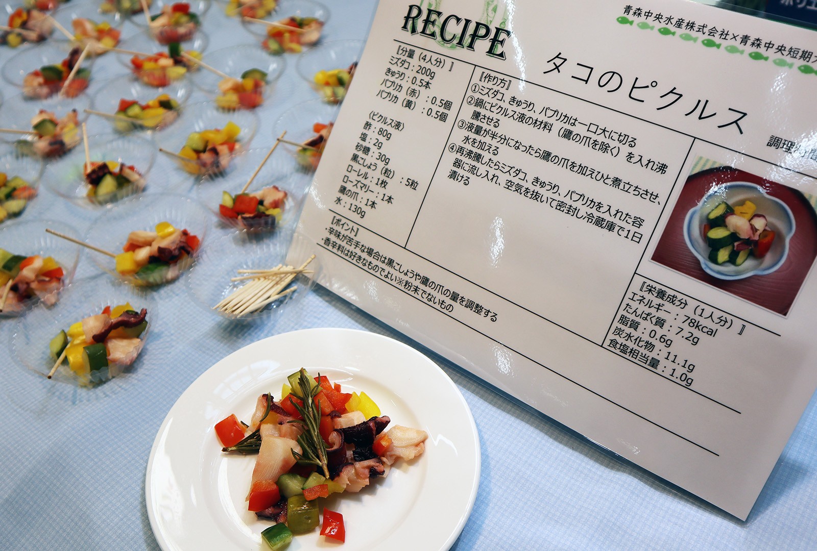 今回発表までこぎつけたレシピは、青森の漁場でもおなじみの、イカ、タコ、ブリ、イワシ、ホタテを使った7品です。コチュジャンの効いたイカのナムルは、生と茹での2パターンを用意。タコもバターソテーとピクルスで、県産野菜と一緒に食べられる2つのレシピを考案しました。イワシは滑らかなすり身にしてあっさりとした潮汁に、青魚のブリはレモン果汁でさっぱりと味付けしたタレを絡め、ホタテはデザートのプリンとして提供しました。