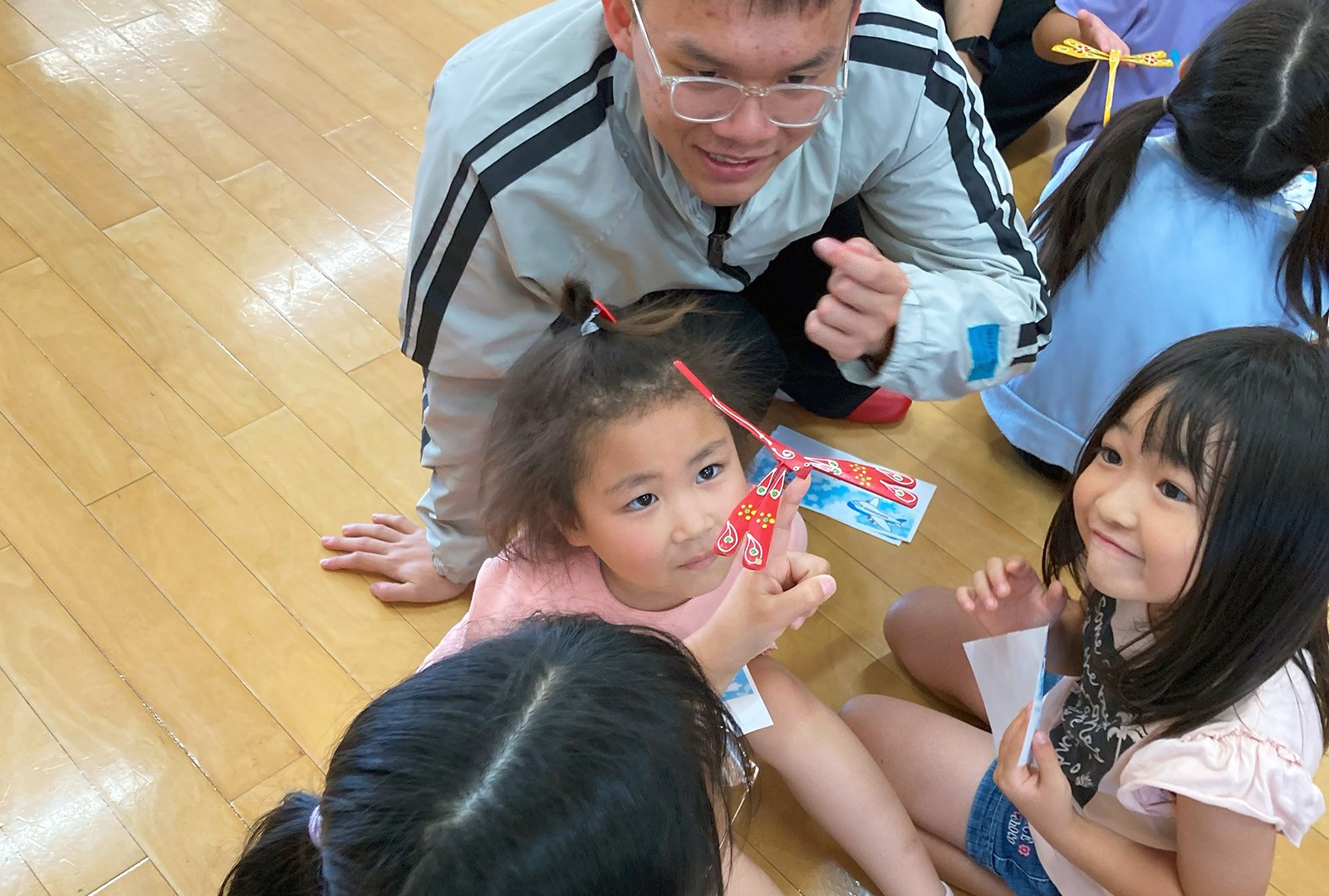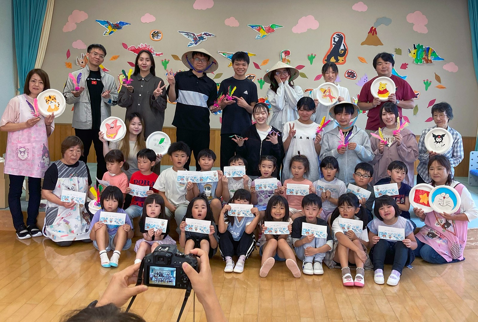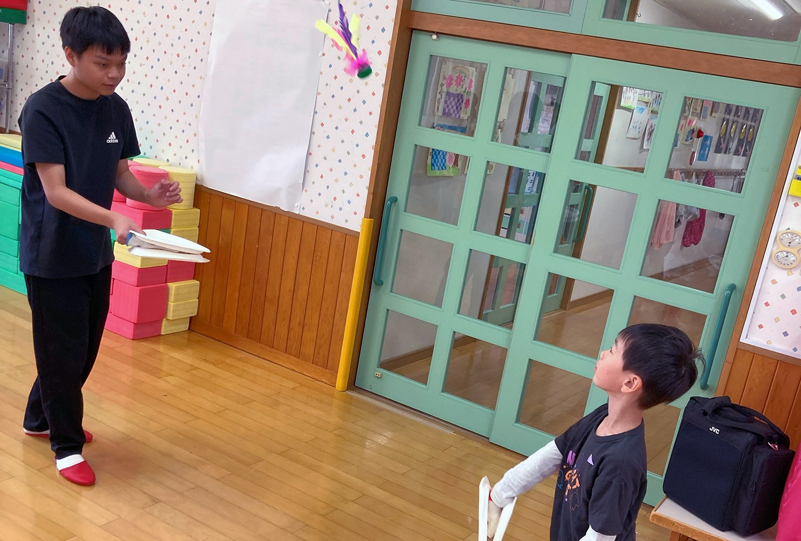 今回はベトナムの伝統的な遊び「Da Cau(ダー カウ)」と、「Nhảy chụm chân(ニャイ チュム チャン)」を披露。短大生が留学生と一緒に、日本の子どもたちに合わせて教材を開発し、園児たちと楽しみました。