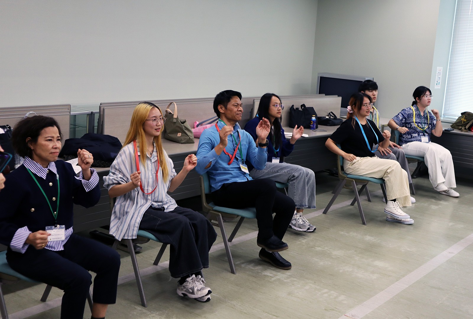 また、今回の教室には、短期研修で青森中央学院大学に来学している、タイのサイアム大学看護学部の学生3名と引率教員2名、さらに通訳として青森中央学院大学の留学生2名も一緒に参加しました。サイアム大学の学生たちは、通訳を交えながら一緒に体を動かし、音楽療法とコグニサイズについて楽しく学びました。