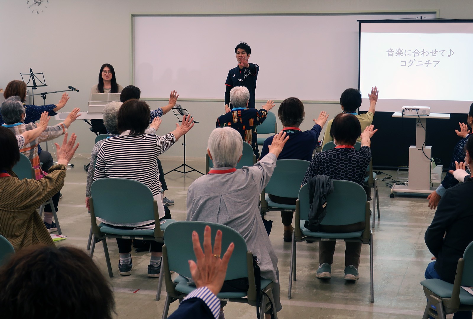 今回は、幼児保育学科の木村貴子准教授による「音楽療法」と、特別養護老人ホーム勝田三思園の機能訓練指導員 木村光先生による、運動と認知トレーニングを組み合わせた「コグニサイズ」がコラボをした予防教室となりました。
