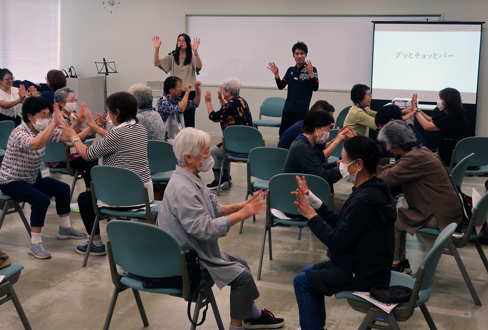 ピアノ伴奏にあわせて行われる動きの指示で、参加者は次々と軽やかに体を動かしていきます。さらに、ペアやグループになって、リズムに合わせながら脳トレエクササイズをするなど、普段とは一味違う特別な予防教室となり、皆さん笑顔で脳を活性化させていました。
