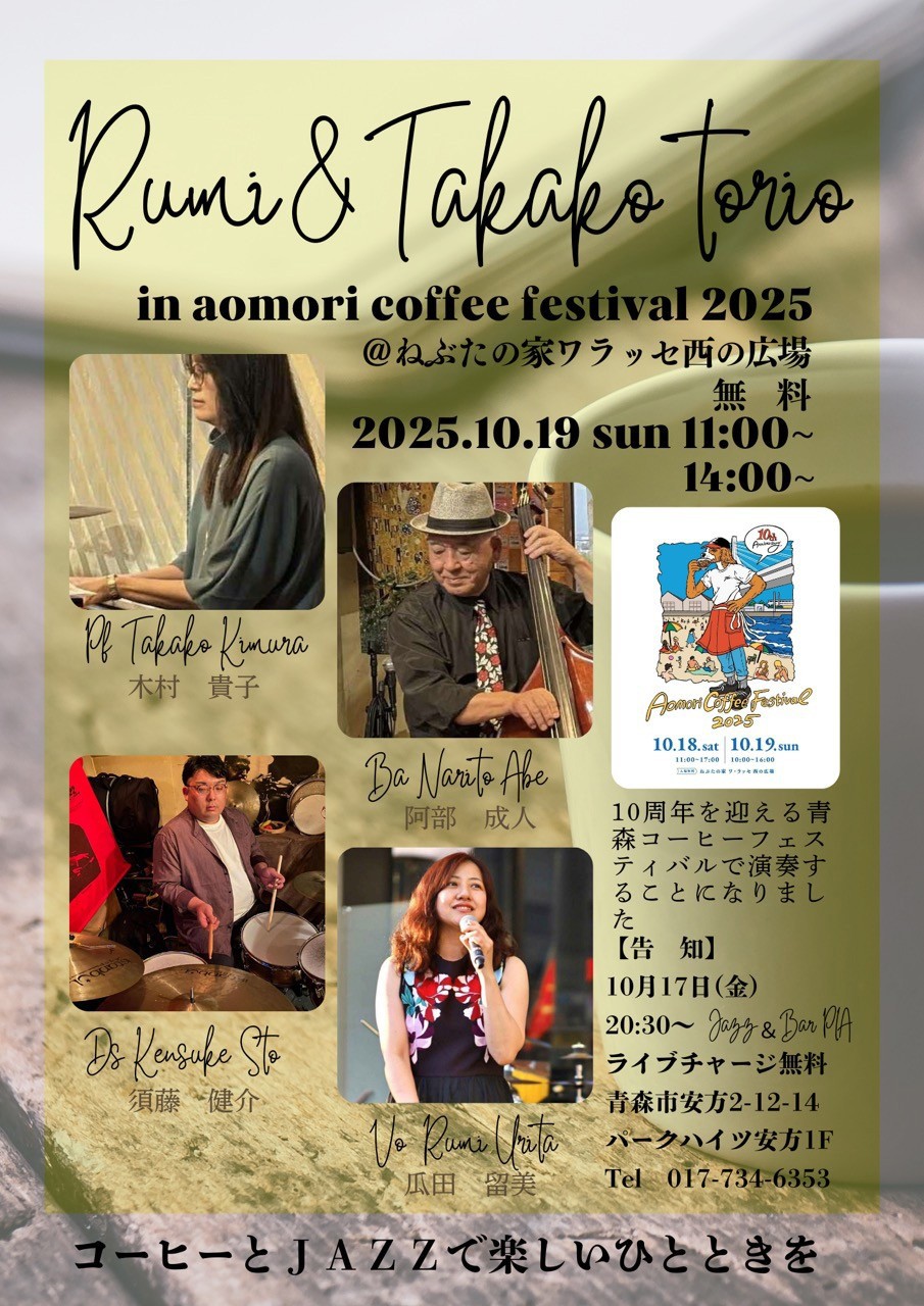 2日目の19日には、フェスティバル会場となっている「ねぶたの家ワラッセ西の広場」で、幼児保育学科の木村貴子准教授がJAZZライブを行います。コーヒーとJAZZで、楽しいひと時を過ごしませんか。