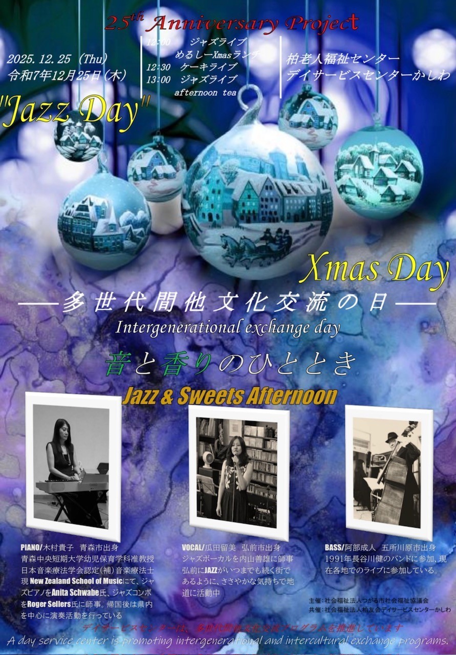 2025年12月25日のクリスマス、「多世代間他文化交流の日」として、つがる市の柏老人福祉センターで『音と香りのひととき~Jazz&Sweets Afternoon~』が開催され、幼児保育学科の木村貴子准教授がピアノ演奏で出演しました。
