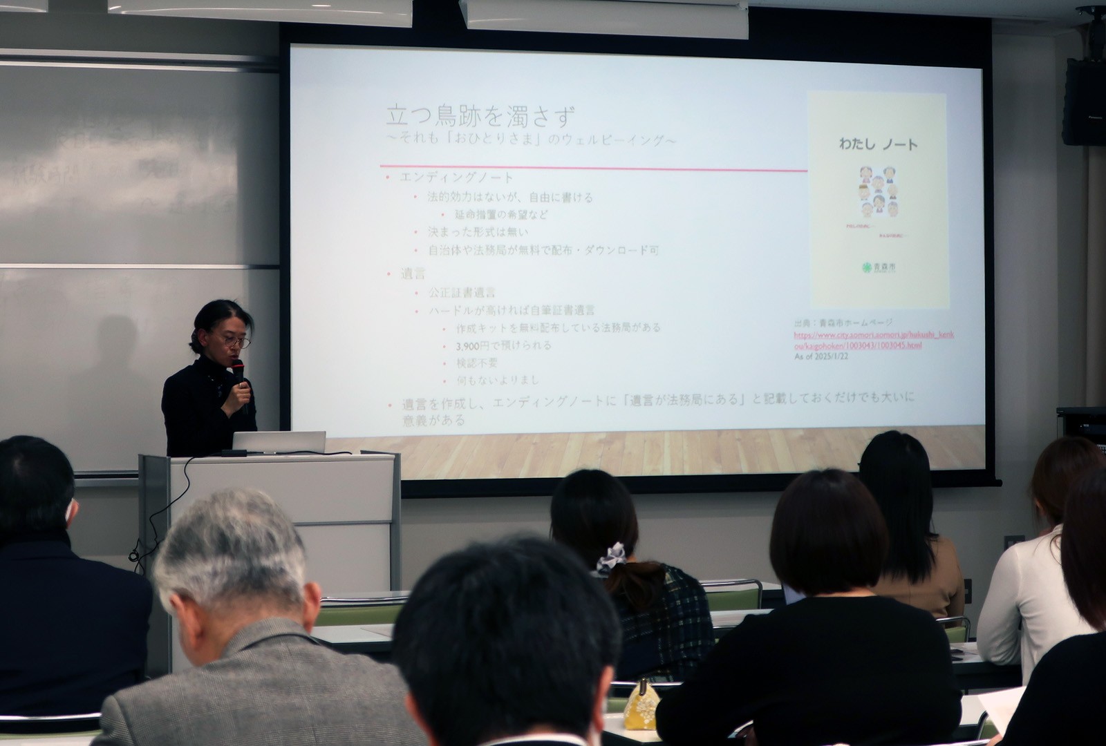 今年度は「地域のウェルビーイングを支える知の融合:健康・共生」と題して、青森中央学院大学の経営法学部と看護学部、及び青森中央短期大学 食物栄養学科の教員が、各自の研究内容をもとにプレゼンテーションしました。