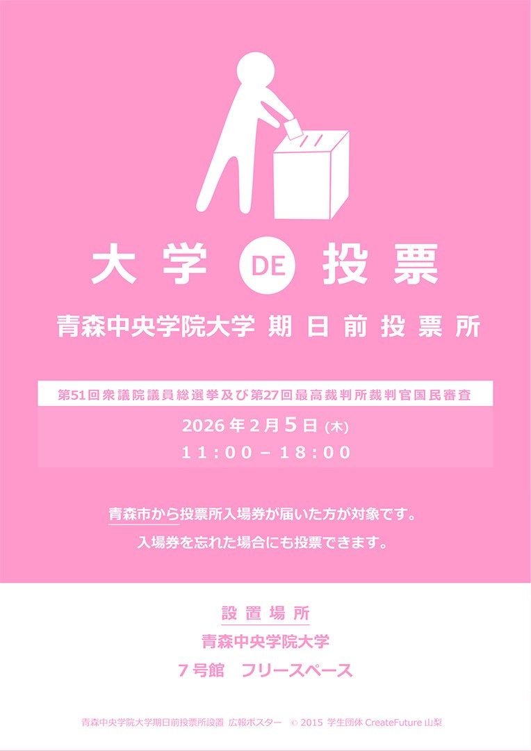 青森中央学院大学では、若い人たちに選挙への関心を持ってもらおうと、2026年2月8日(日)が投票日の第51回衆議院議員総選挙・第27回最高裁判所裁判官国民審査の期日前投票所を大学内に設置します。
