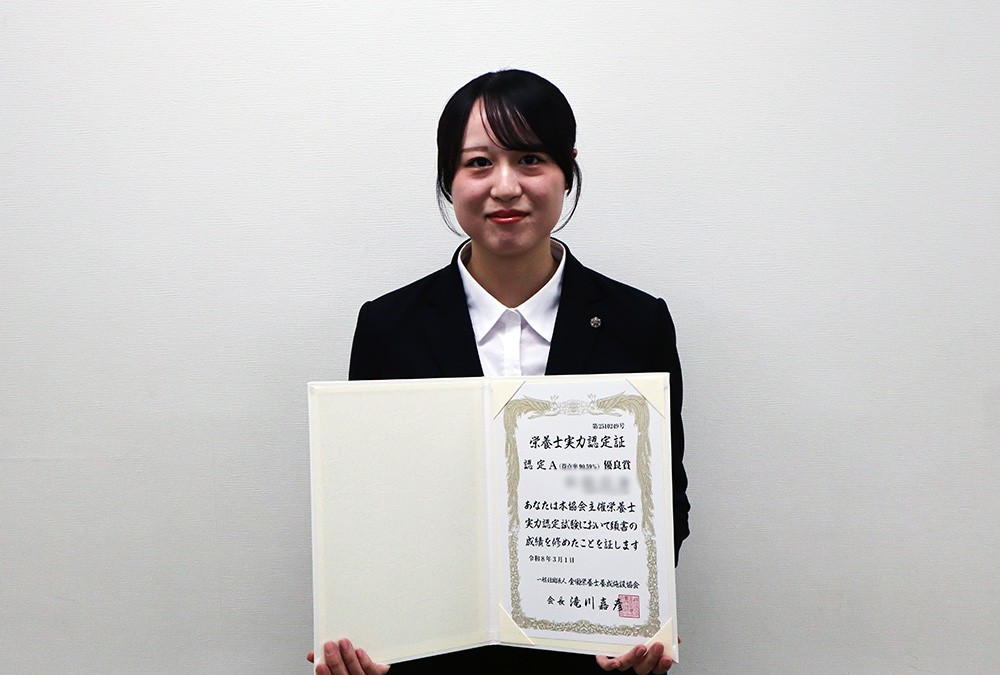 髙橋さんは、高い得点率で成績優良者として栄養士としての実力の高さを認定されました。